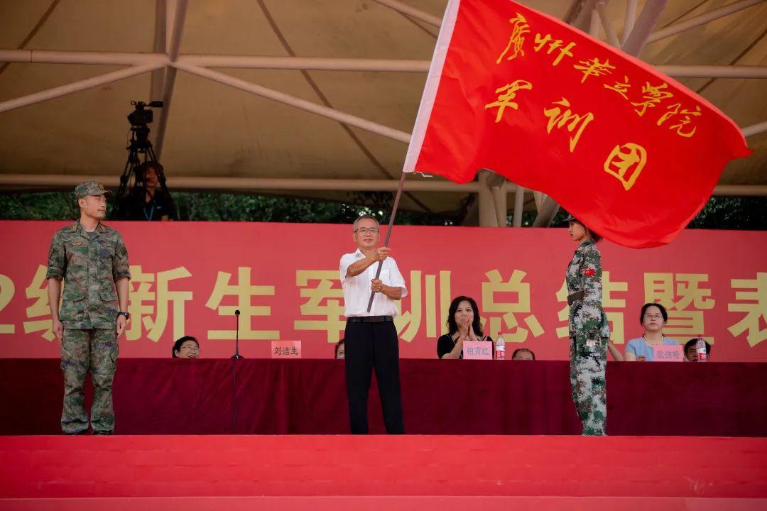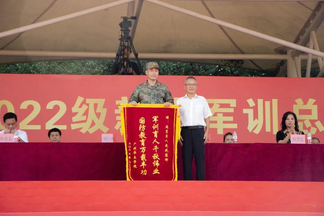 学校向广州市越秀区人武部军训团赠送锦旗,刘洁生校长接回军训团团旗。至此,广州校区2022级新生军训圆满结束。