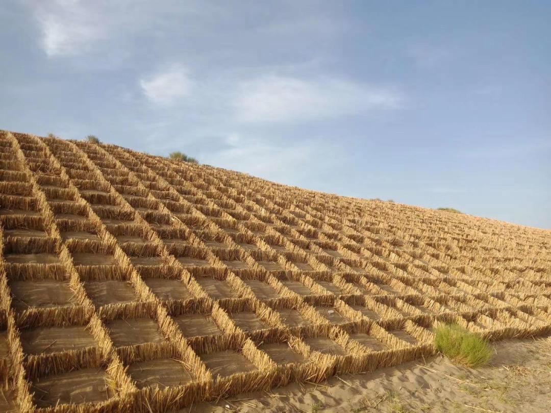 为了避免流沙占路的情况,修路工人一边修路,一边固沙。首先,他们在距离公路三百米外的上风口安装“围栏”,这些高1.5米的纤维网会将大部分风沙拒之门外。其次,他们在纤维网与公路之间,摆满了沙袋摆放的方格,这些一平米左右的方格中间都是空隙,一旦有风沙来到这里,就会被挡在沙格之中。最后,公路沿途还有碎石头筑起的最后一道壁垒。三重防线下,最大程度地避免了流沙覆盖公路。