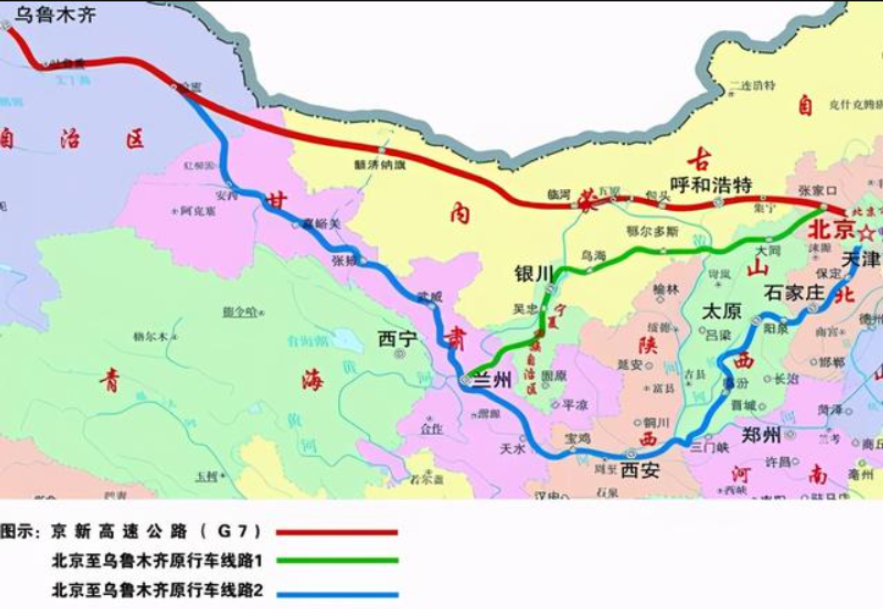 京新高速自2012年9月动工,2019年4月基本全线贯通,2021年6月全线建成通车。以前从乌鲁木齐到北京需要走霍连高速,但是现在可以直通北京,路程被缩短了1300多公里。