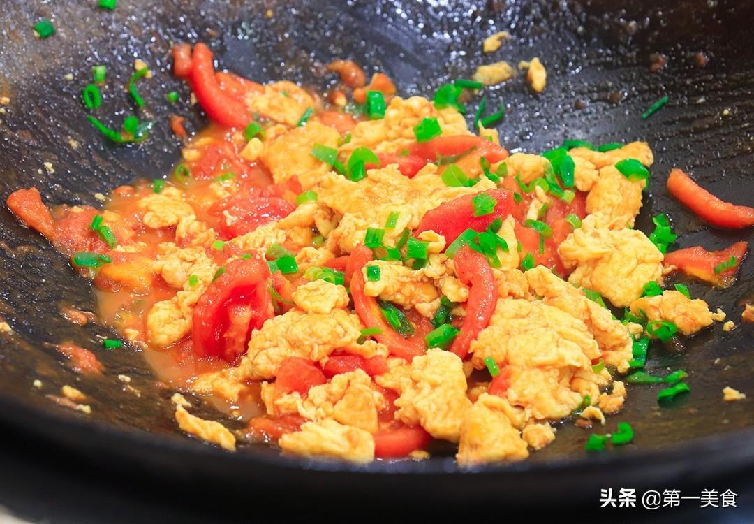 鸡蛋炒好后倒入西红柿,在炒西红柿的时候可以加点白糖和生抽,提鲜。然后开中火炒出西红柿的汁水。西红柿炒得软烂、汁水香浓的时候。关火加入少许食盐调味,撒上葱花利用余温把葱花炒香美味即成。