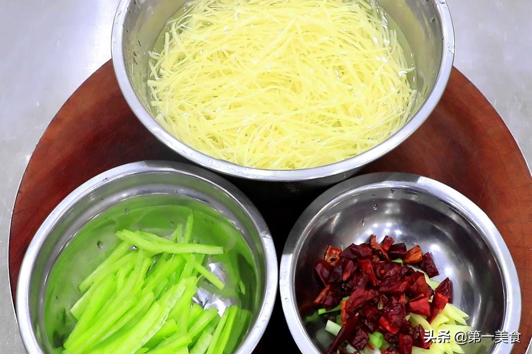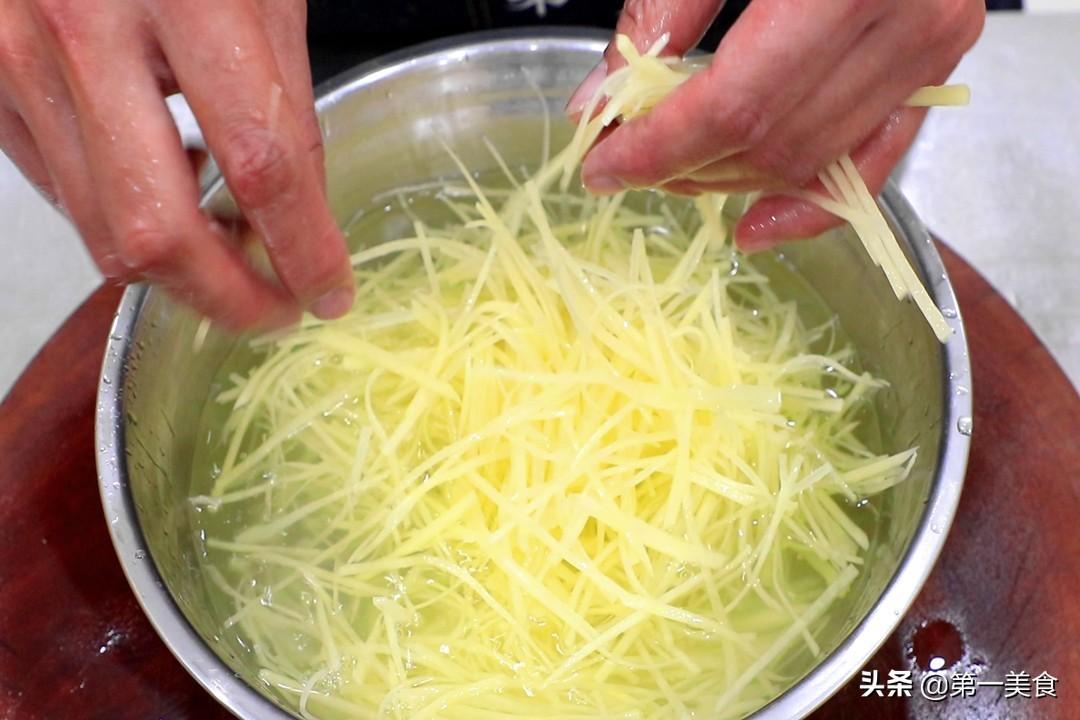 用擦丝器把土豆擦成丝后,迅速放入清水中隔空气,以免氧化变黑,然后把土豆丝用清水多抓洗几遍,把上面的淀粉洗干净,洗至水非常清澈为止。