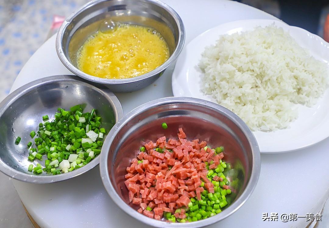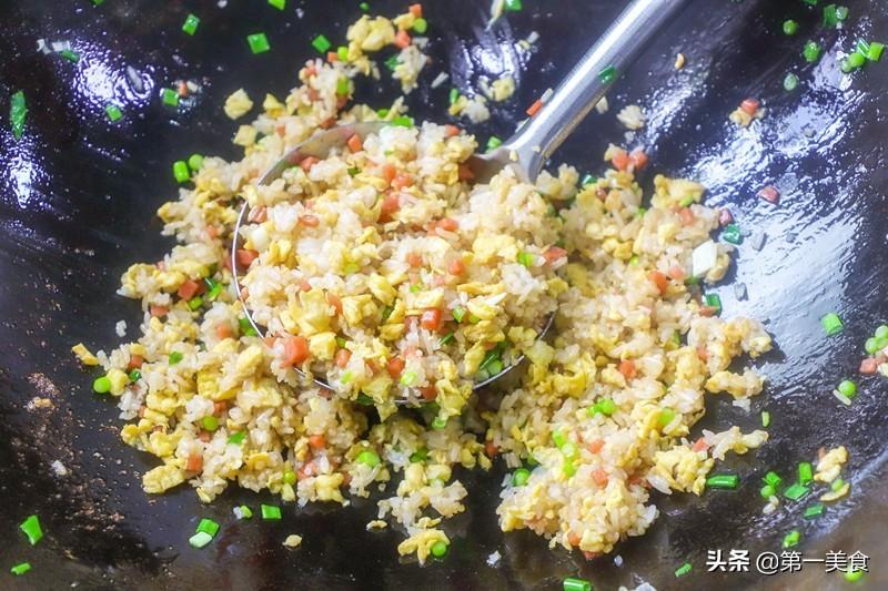 3.锅内再烧油,倒入剩米饭,开中小火不停地翻炒3分钟,米饭炒散、炒香以后。把食材倒入锅中翻炒至断生,加入食盐2克,胡椒粉1克,鸡粉1克,翻炒化开调料给米饭入味。