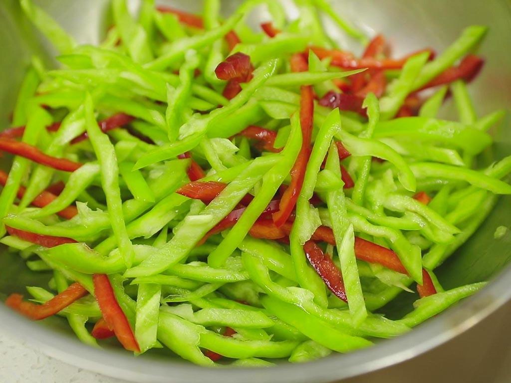 青椒破开去籽斜刀切成丝,再切一点红椒丝搭配颜色。切好以后辣椒用清水淘洗,去除残留的辣椒籽以免影响口感。大葱切成圈、生姜切成片放在一起,再切一点辣椒段备用。