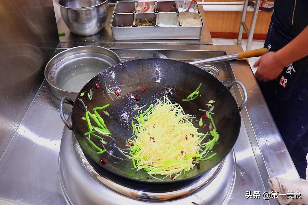 热锅凉油,倒入葱姜、辣椒和花椒,开小火炒香。然后放入青椒丝翻炒几下,把土豆丝沥干水分放入锅中,开大火爆炒20秒钟,把土豆丝炒断生,家庭小灶的话大概需要50秒钟。