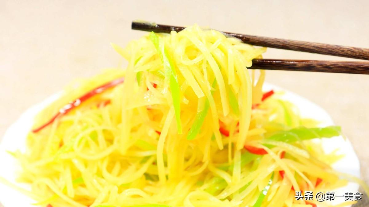 然后加入食盐2克,白糖少许提鲜,鸡精2克,继续翻炒10秒钟,土豆丝入味以后,淋入白醋10克增加脆爽的口感,烹出香味以后立即出锅,一盘酸辣适中、清脆可口的酸辣土豆丝就做好了。