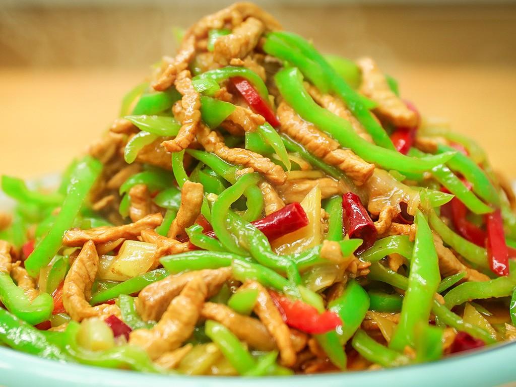 炒至肉丝出油放入青红椒丝,快速地把青红椒炒断生。再加入少许水淀粉让肉汁更好地包裹在青椒上面,美味即成。