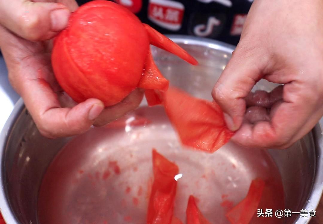 准备一个西红柿洗干净去皮。因为西红柿表皮,会残留一些农药物,其次就是西红柿去皮炒的话,更容易炒出红汁,但不能炒得太碎,以免汁水过多影响口感。