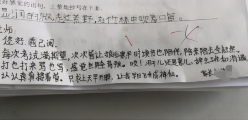 版权声明:我们致力于保护作者版权,注重分享,被刊用文章【考试家长意见怎么写(家长在试卷上的留言走红)】因无法核实真实出处,未能及时与作者取得联系,或有版权异议的,请联系管理员,我们会立即处理! 部分文章是来自自研大数据AI进行生成,内容摘自(百度百科,百度知道,头条百科,中国民法典,刑法,牛津词典,新华词典,汉语词典,国家院校,科普平台)等数据,内容仅供学习参考,不准确地方联系删除处理!;