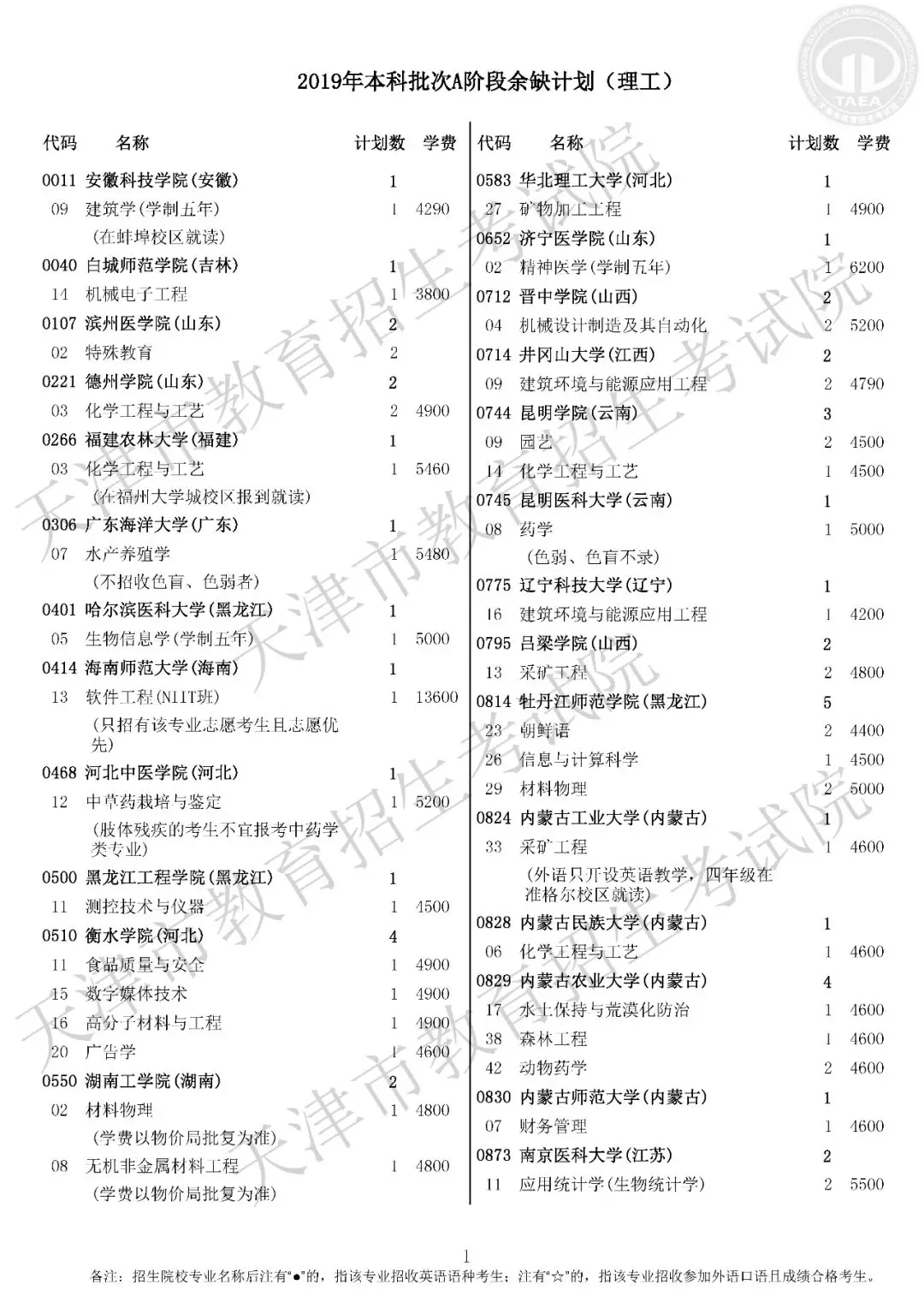 普通本科批次A阶段征询志愿院校余缺计划表(理工类)