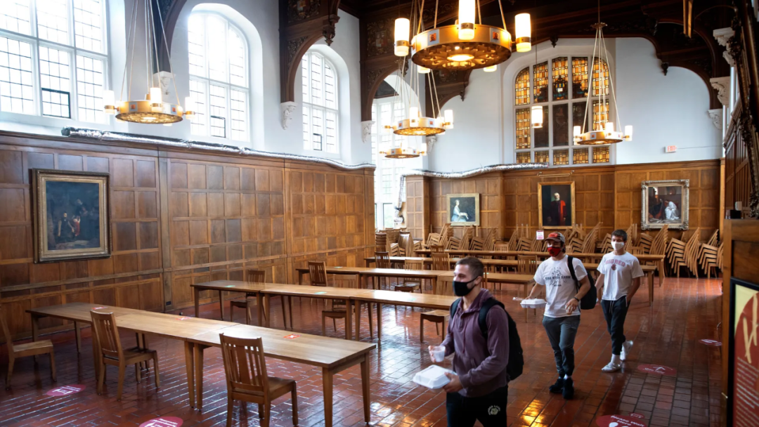芝加哥大学南校区的Cathey餐厅有很多有特色的设计细节,包括大胆桁架的深色木质天花板、插着蜡烛的枝形吊灯和木质壁板。