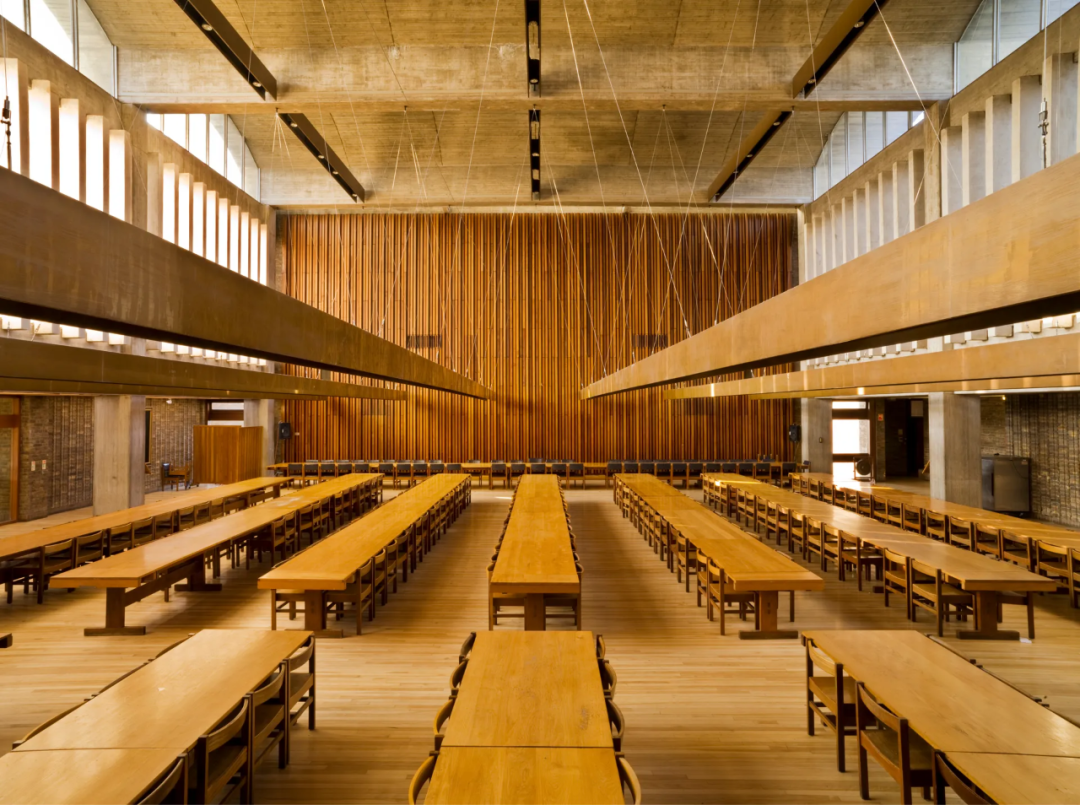 虽然剑桥大学也有其他的餐厅也非常华丽,但Churchill College中央大楼的这个餐厅还是从中脱颖而出。这座建筑由Sheppard Robson and Partners在60年代设计,是剑桥第一个现代主义建筑,并启发了其他高等教育机构的外观变化。