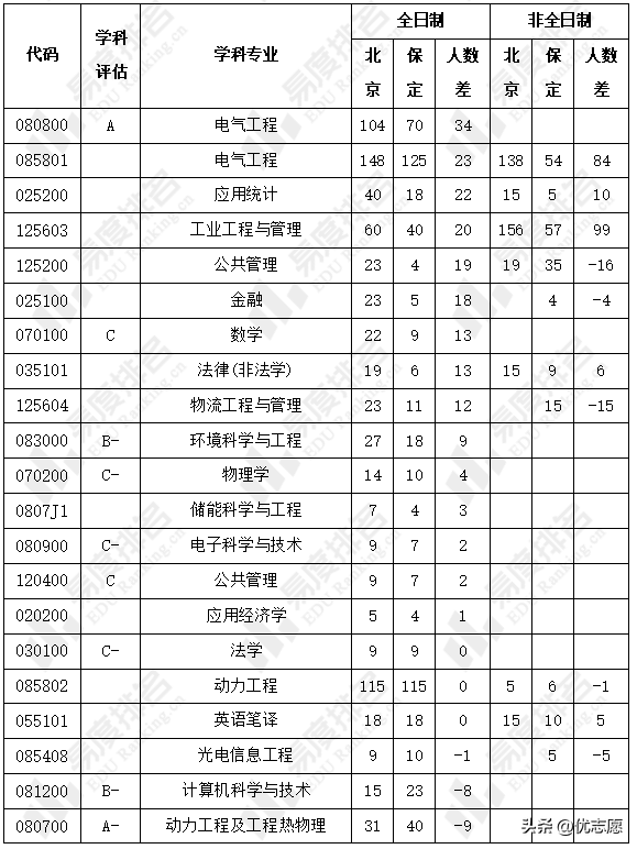 全日制专业中,北京校区的应用统计、工业工程与管理、公共管理、金融4个学科专业招生人数均多出保定校区15人以上,且两校的最低录取分数相差不大,建议报考北京校区;控制工程、机械工程、环境工程可报考招生人数更多的保定校区。