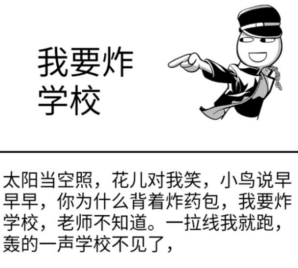 但也正因为它旋律优美经典,小学生们认为这是一个绝好的恶搞机会,因此他们脑洞大开地将这首积极向上的《上学歌》改编成了恶趣味的《炸学校》。