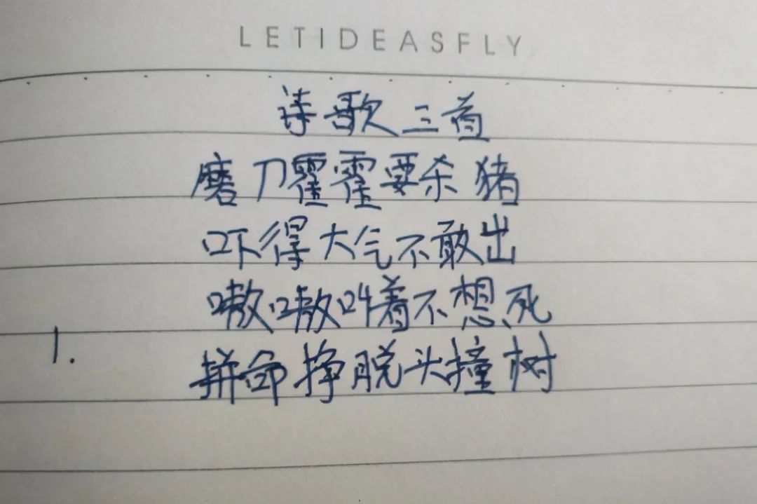 这位小学生4行字写出了一头猪被杀前的挣扎,画面感倒是有的,但也明显能看出是在恶搞。