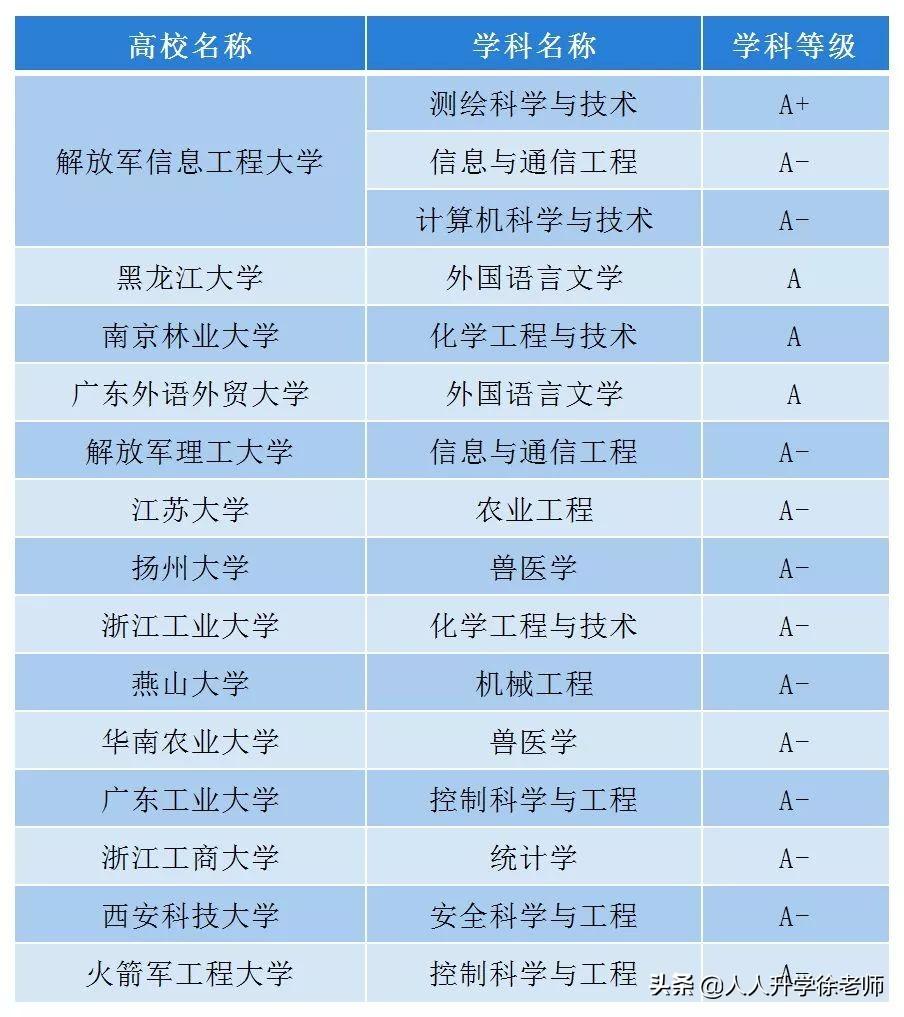 注:第四轮学科评估中,前2%(或前2名)为A+,2%~5%为A(不含2%,下同),5%~10%为A-,10%~20%为B+,20%~30%为B,30%~40%为B-,40%~50%为C+,50%~60%为C,60%~70%为C-。下同。