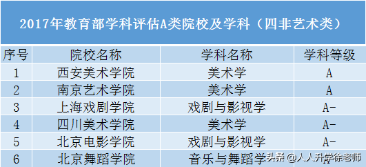 在2017年教育部学科评估中,四非艺术类院校的评选结果是非常可观的。其中,西安美术学院、南京艺术学院的美术学评估结果均为A类,而上海戏剧学院、北京电影学院的戏剧与影视学,四川美术学院的美术学,以及北京舞蹈学院的音乐与舞蹈学的评估结果均为A-等级。