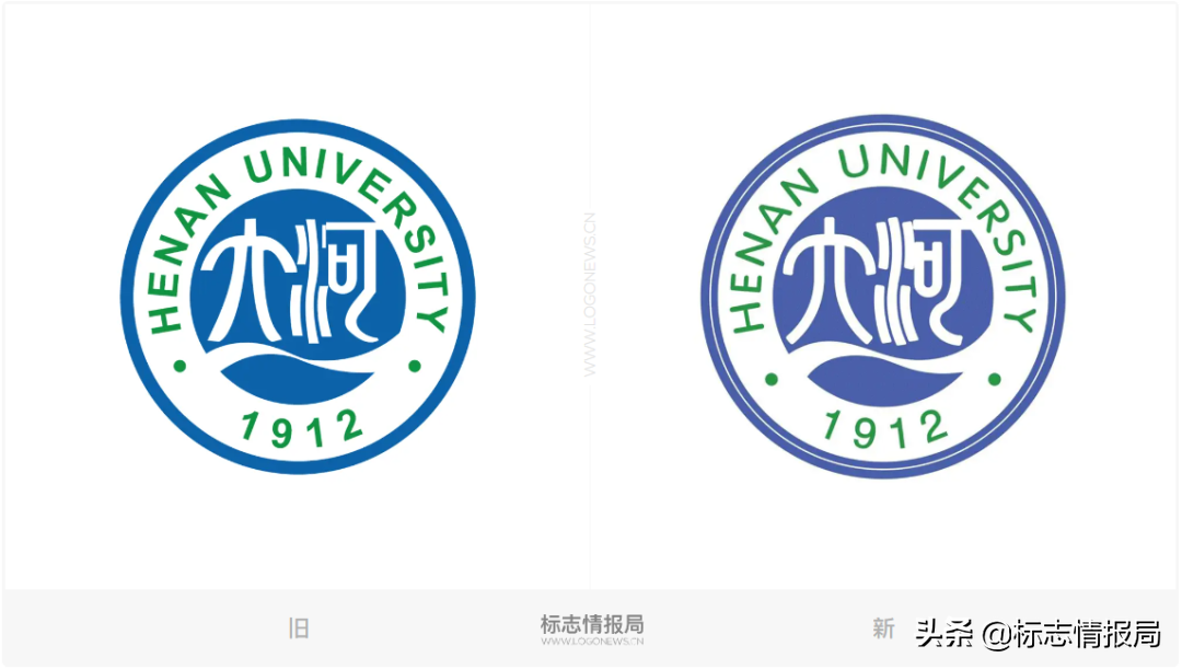 优化校徽中心的篆书体「河大」二字(虽然要从右往左读,但相信有很多人会读成「大河」)。环绕在圆形周围的「HENAN UNIVERSITY」从之前的黑体调整为圆幼体,外部的蓝色圆环由单线条更改为双线条。