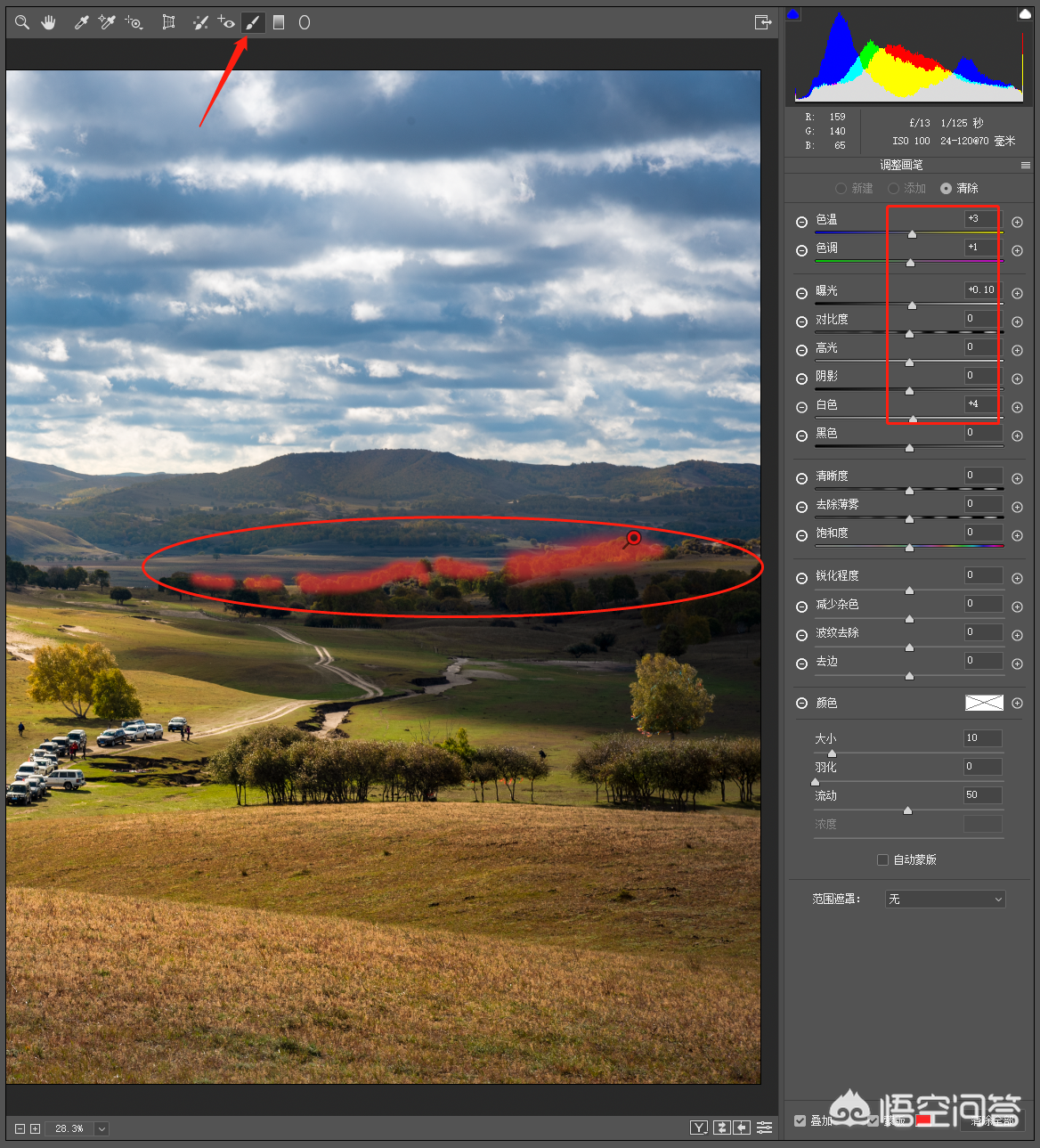 15、这里我调整的是远处的山,如下图红色参数方框内,由于调整的山也是受光面,所以适当加了一点色温,让山呈暖调。其次是曝光,受光面肯定也要比正常的区域更亮一点,加了0.1的曝光和白色。最后饱和度减了一点,不过这也是非常适合生活常识,越远的地方能见度越低,饱和度自然而然也就没有那么高了。