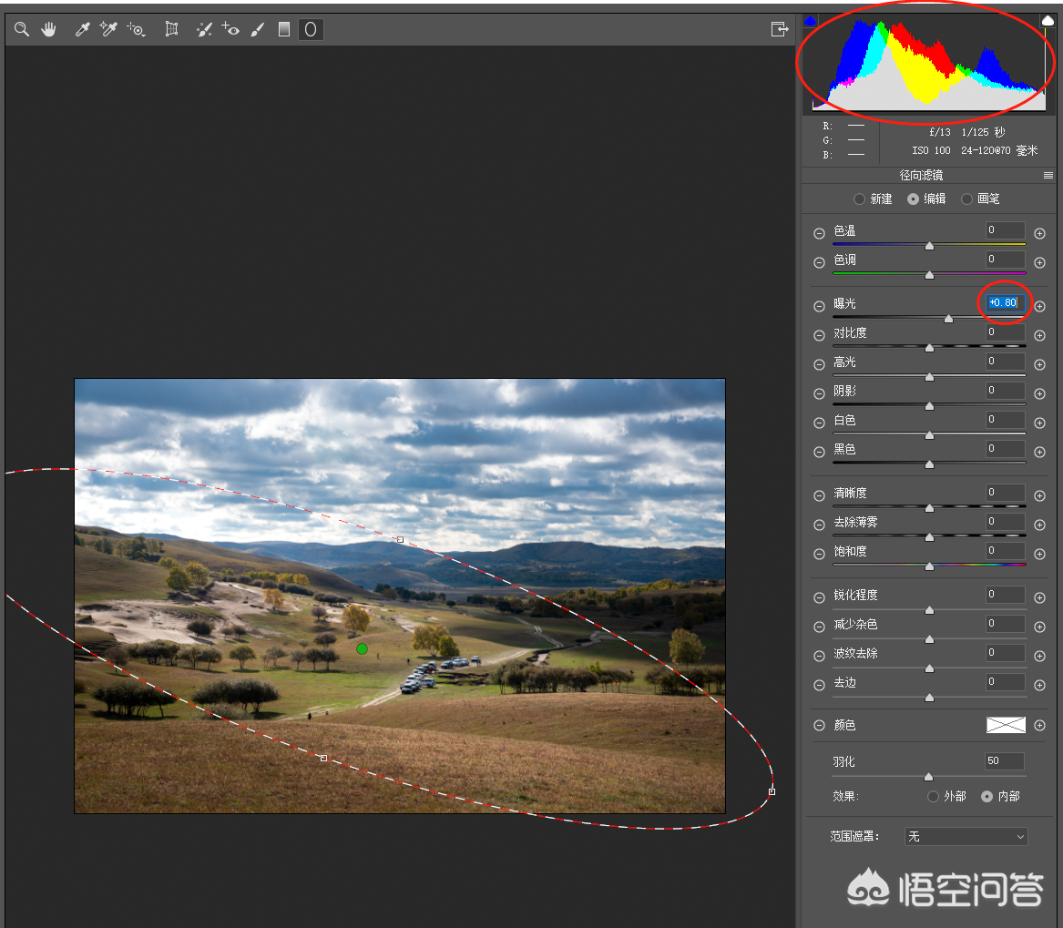 1、这里优先使用到的是径向滤镜,看图标也能看出它是属于圆形编辑方式。点击径向工具后,在图片上拖动一个圆圈,然后根据想要调整的范围来拖动圆圈的四周调节点,调至合适大小。如下图,右边的红色方框则是我们需要调整的各种参数,参数细致,甚至更加优越于基本调整界面工具。