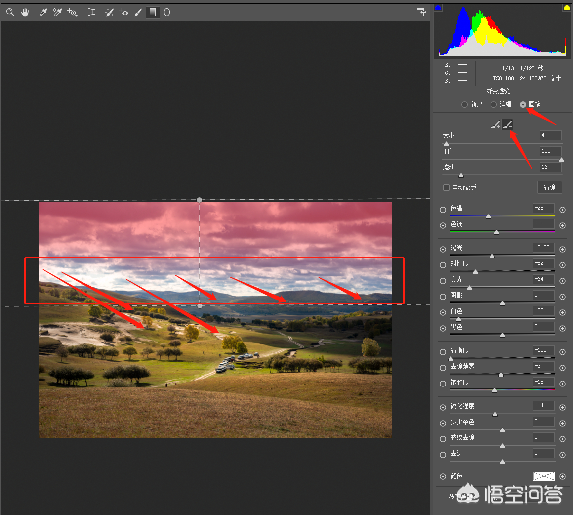 21、局部处理还有一个需要注意的地方,特别是风光类型的图片。那就是天空的云彩,一般的处理方式是让天空的云软起来,地面已经很锐很硬了,所以将天空处理成柔软的风格,也是一种很好的对比。不过天空的云处理成柔软风格也很合理,因为本来距离就远,其次云本来就是软的。如下图的处理方式,使用的是渐变滤镜,呈矩形的编辑区域,非常适合选择天空这样平整的区域。
