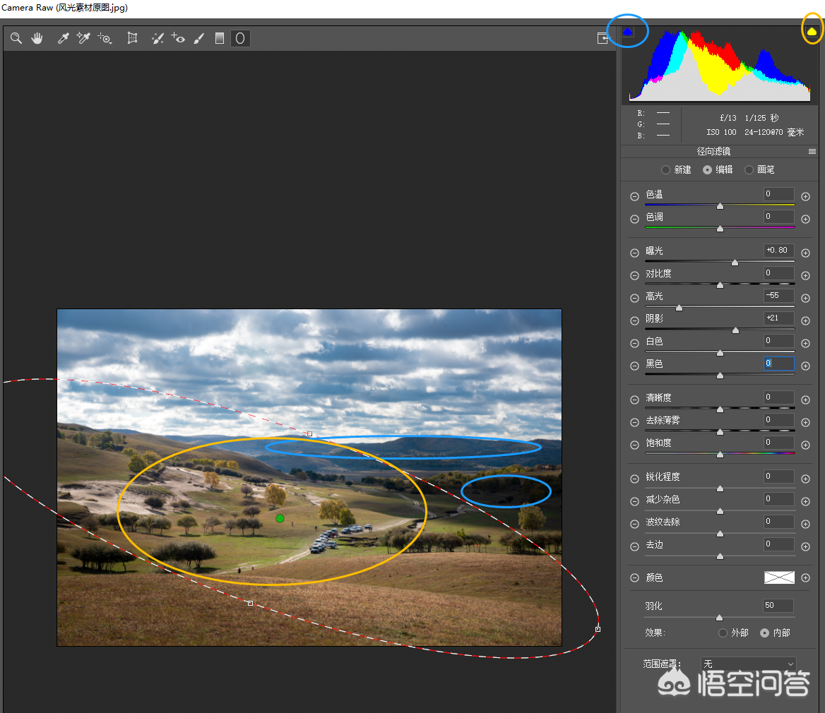 7、当我们将高光减低一点,之前直方图最右边的溢出区域慢慢拉回来了一些像素。观看下图直方图,红色圈的地方出现了红色与黄色的信息,但溢出图标还是白色,说明白色还是占主导,其次是红色与黄色的亮度最亮。
