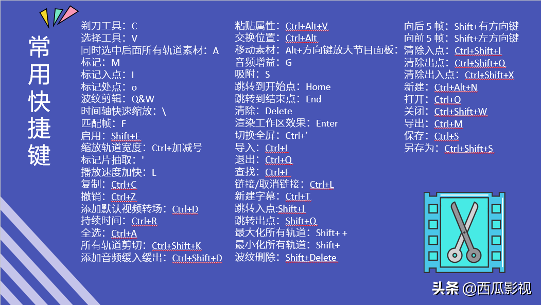 不知道大家都用什么软件剪辑视频,我是比较推荐用PR来做剪辑的,给大家整理了一下PR的常用快捷键,希望对大家有所帮助,谢谢大家
