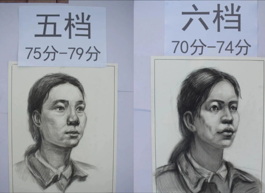 而70分段的五档和六档,与优秀试卷的差别就更大了,即使非专业的人也能明显看出差距不是一星半点。无论头发还是面部都显得笔法有些“粗糙”。