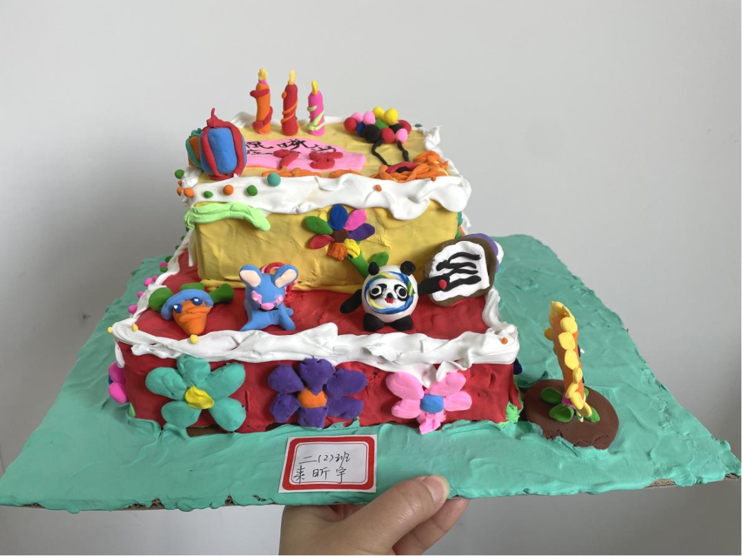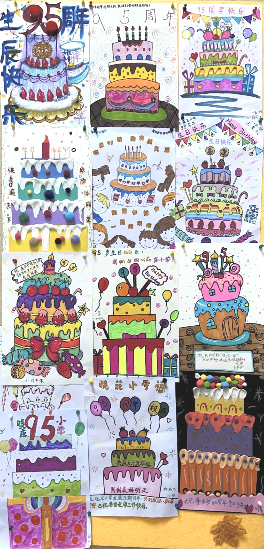 为了庆祝学校95周年诞辰,陶娃们用绚丽的色彩创作出一幅幅漂亮精致、寓意丰富的创意蛋糕画,瞧!生日蛋糕上还写着他们诚挚的祝福语呢!