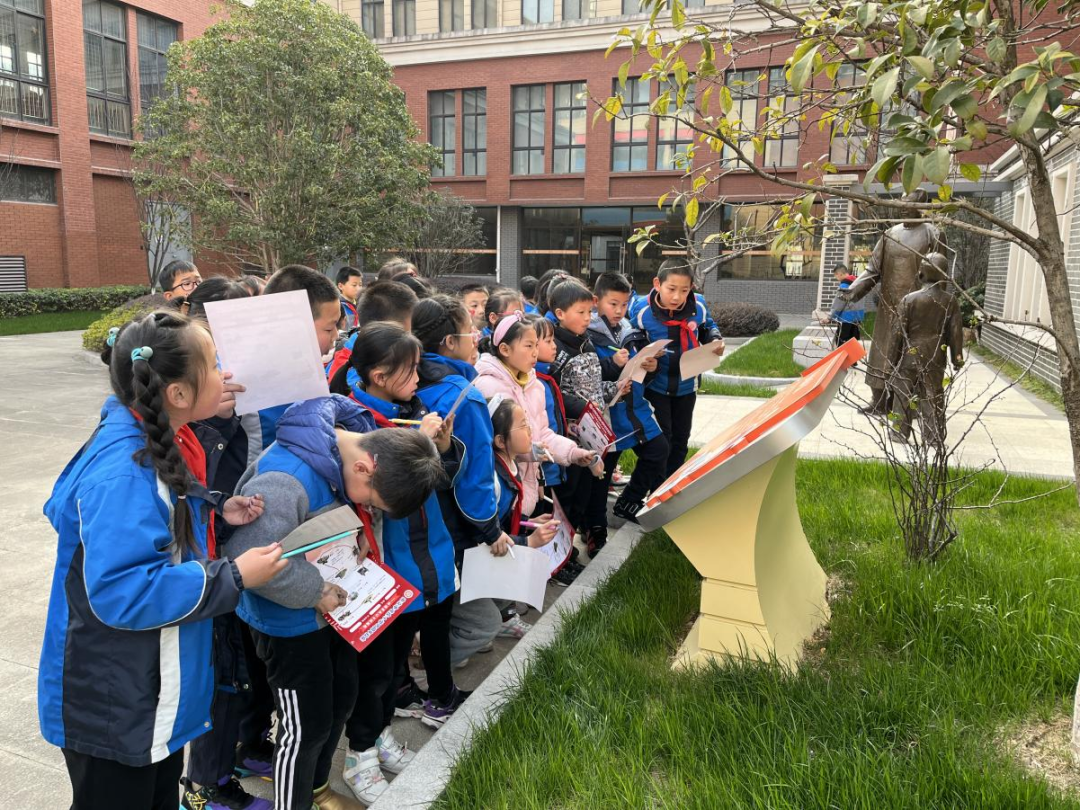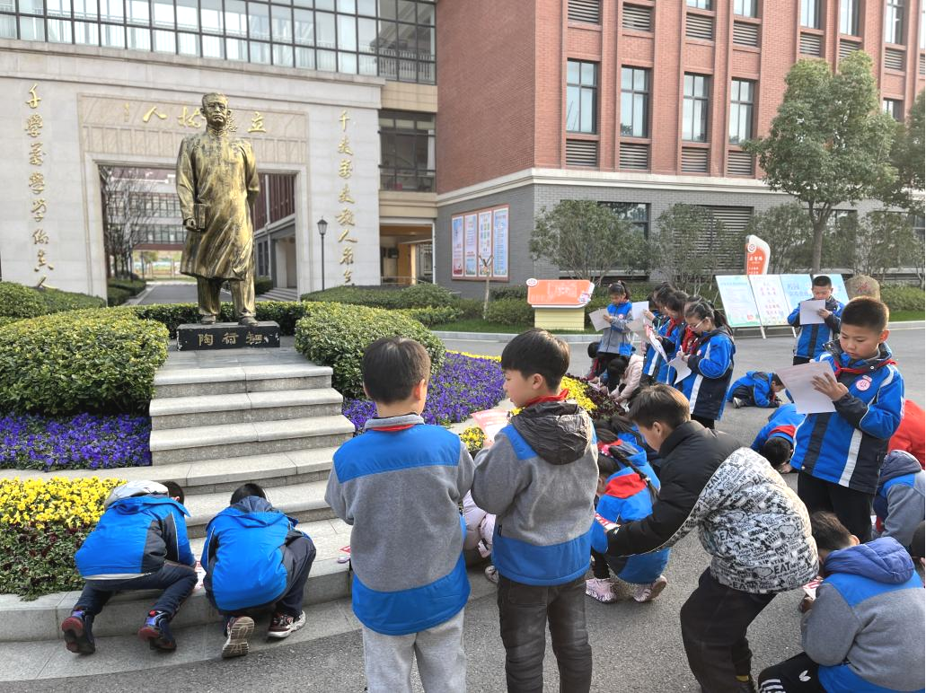 在各班班主任的带领下,全体陶娃手拿校园景点打卡路线图依次前往行知塑像、感恩亭、树人厅、求知坊、知错亭、乐学棚、放生园以及光阴台八大景点,班主任为他们讲述着各个景点的由来与故事。打卡结束后,陶娃们将打卡所学知识认真仔细地填写在路线图的空格中。