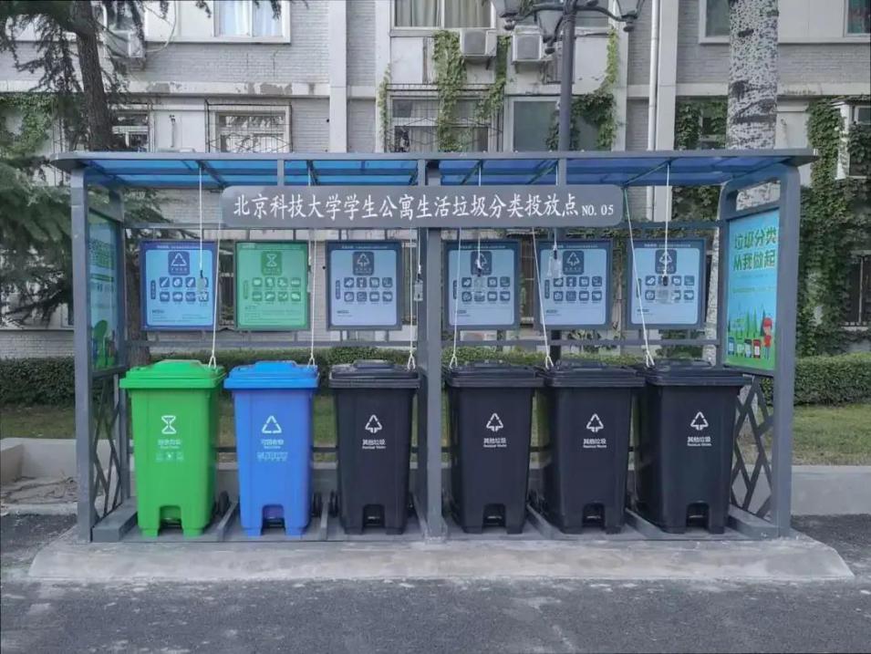 2020年10月1日起,北科大公寓楼里的垃圾桶全部取消,学生们需要把垃圾送至垃圾分类投放点集中处理。为了保障垃圾分类工作顺利进行,相关部门不仅提前试点、积极调研、合理设置投放点和垃圾桶数量、积极宣传,还全程值守、指导分类、及时转运、二次分拣、清洁桶身,并制作了可回收物环保收集袋提供给每一间宿舍,每周有保洁员定时上门收取。