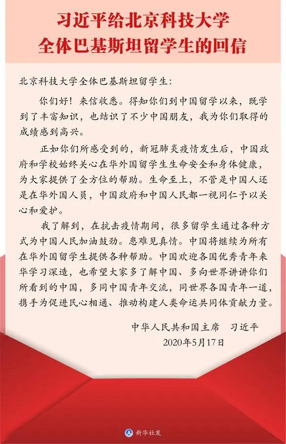 释义:2020年5月17日,习近平总书记给北京科技大学全体巴基斯坦留学生回信,对各国优秀青年来华学习深造表示欢迎,鼓励他们多同中国青年交流,同世界各国青年一道,携手为促进民心相通、推动构建人类命运共同体贡献力量。