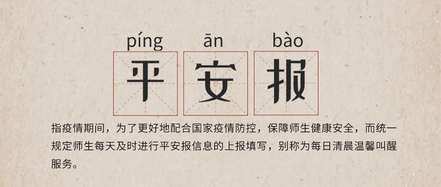 释义:指疫情期间,为了更好地配合国家疫情防控,保障师生健康安全,而统一规定师生每天及时进行平安报信息的上报填写,别称为每日清晨温馨叫醒服务。