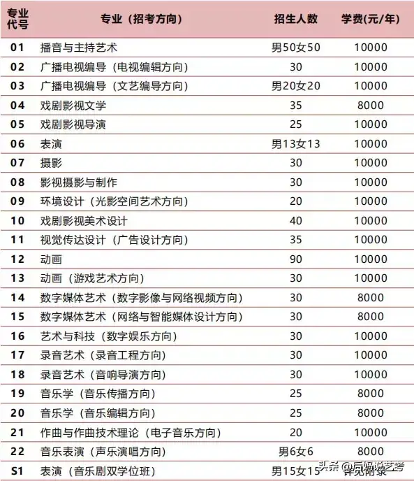 艺术类招生专业:广播电视编导、表演(影视剧表演方向)、音乐表演、视觉传达设计、环境设计、产品设计、动画