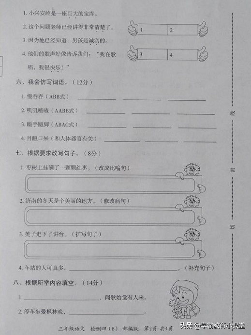 第七题,改写句子。这个题目实际上是为作文书写准备的:有的可以让学生把句子写得更形象,有的可以帮助学生修改常见的语病。