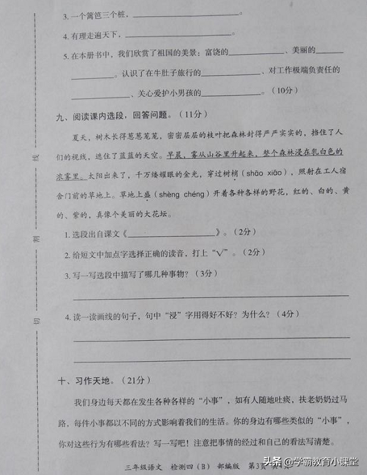三年级语文上册期末考试试卷的试卷结构、考查难度已经有了天壤之别。就基础知识来说,考查的题量、难度都很大,这是因为教材设计者和老师“默认学生已经养成了良好的语文学习习惯”;阅读和作文的考查难度明显加大,三年级小学生应该转变语文学习方法,逐渐把阅读和作文放到越来越重要的位置。