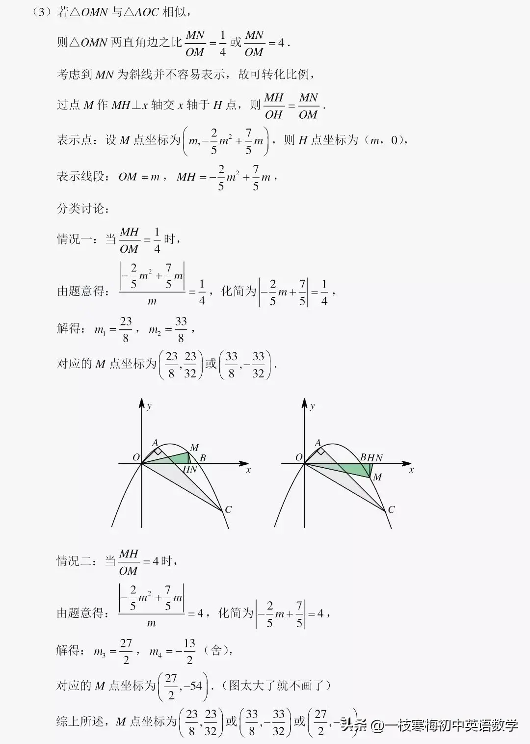 【小结】对于直角三角形而言,从三角函数的角度来看,两直角边对应成比例与有一组锐角三角函数值相等其实是一回事,对于位置特殊一点的(比如直角边与坐标轴平行),直接表示线段计算,而位置比较一般的可以通过(1)表示线段;(2)构造三垂直相似得到结果.