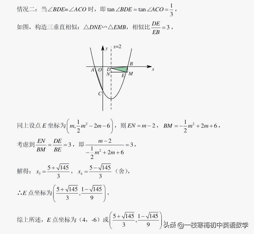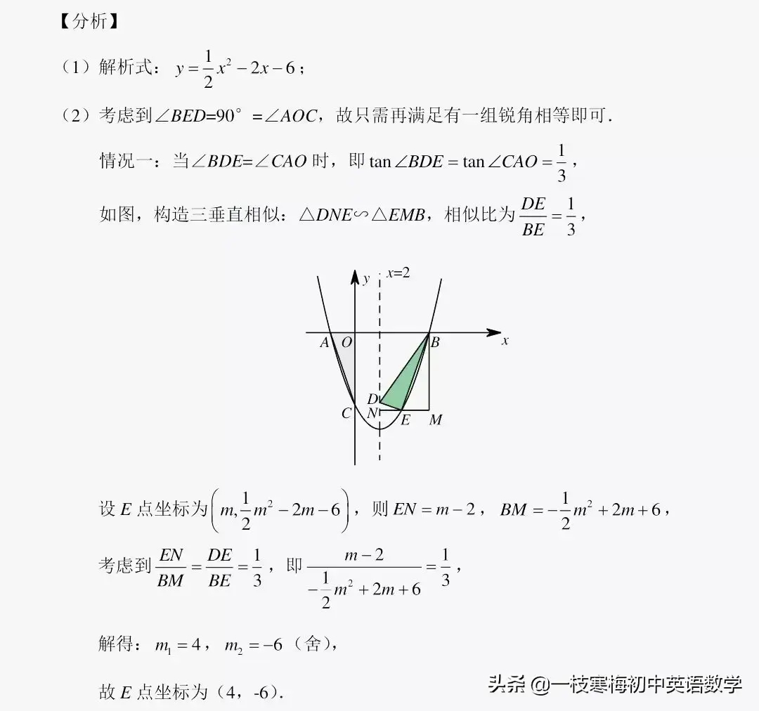 (2)点B是该二次函数图象与x轴的另一个交点,点D是直线x=2上位于x轴下方的动点,点E是第四象限内该二次函数图象上的动点,且位于直线x=2右侧.若以点E为直角顶点的△BED与△AOC相似,求点E的坐标.