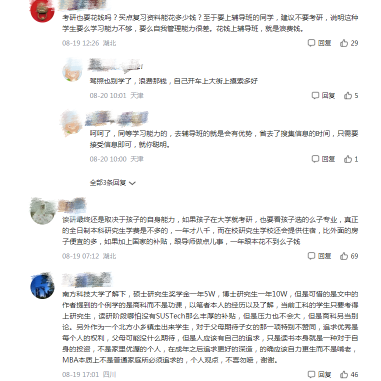 父母们还傻傻地以为,孩子们这是上进,是想要奋发图强。真正有实力考研的学生,只需要买一些复习资料,买一些便宜的网课,就能够获得不错的成绩。有些学生花了好几万元,也找不到复习的窍门,对于这样的学生来说读研实在是一种折磨。