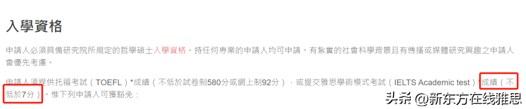该校的统一雅思要求是总分6.5分,不过新闻学院部分专业要求需要达到总分7.0,比如传播学哲学硕士、全球传播专业等就需要拿到雅思7分。