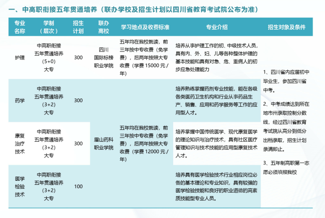 学校现开设有中高职衔接五年贯通培养专业:护理、药学、康复治疗技术、医学检验技术;