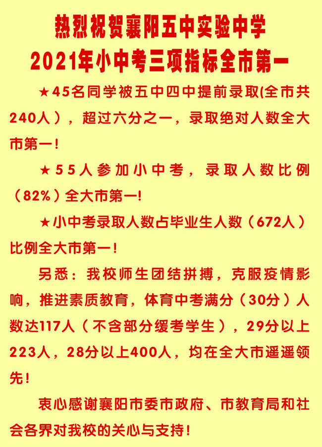 襄阳五中实验中学是2010年经市教育行政部门批准、依托襄阳五中优质教育资源和教育品牌创办的一所国有民营中学,初中部设在襄阳市古城区中心地带襄阳五中老校区。学校坚持“小班化教学、全封闭寄宿制管理、班级导师制、突出外语和创新教育”等办学特色。近几年襄阳四中、五中上线率超过60%,小中考保持全市前三强,大中考各项指标全市遥遥领先。