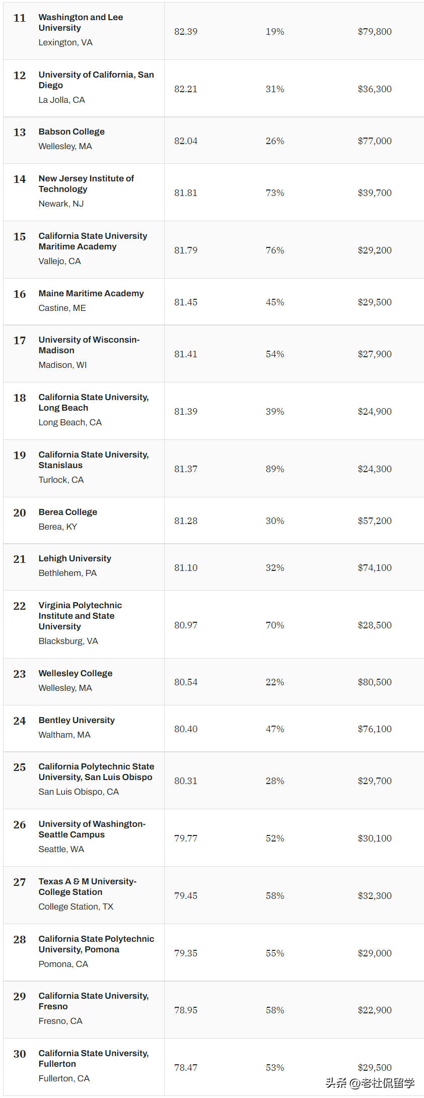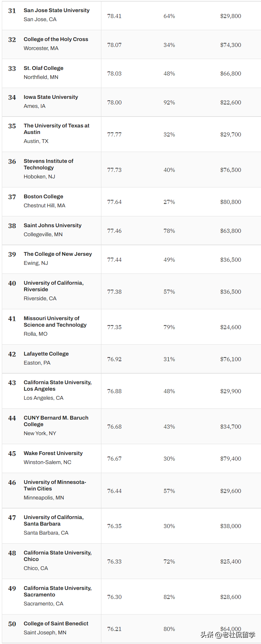教育质量(30%):6年毕业率、增值毕业率、同行质量、讲师访问、财政困难、佩尔助学金接受者结果。负担能力(40%):学位净价值、不同收入阶层的学生支付的净价、负债、偿还债务的能力、增值学生贷款还款方法。产出(30%):大学入学后 10 年的收入、毕业生收入、增值收益、大学记分卡就业成果、不同专业收入调整、经济流动性指数、投资回报率。所谓“不买最贵的,只买最好的”,下面是Money 2022年Top 50的美国大学排名。