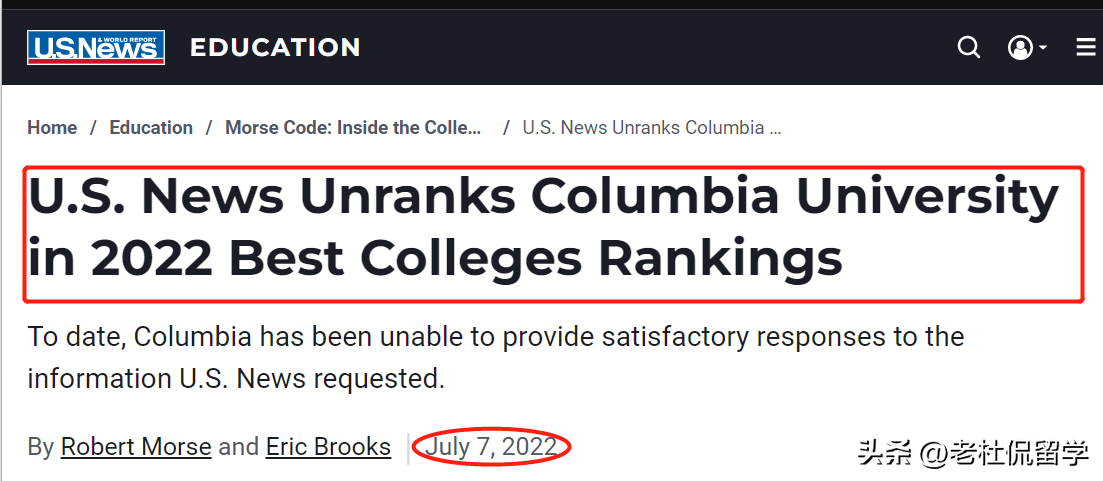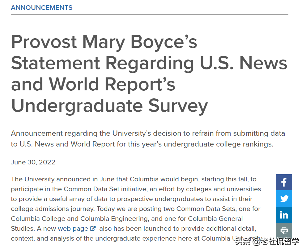 于此同时US News & World Report也在7月7号在其官网发布相关消息取消“哥大”本年度排名,并预测“哥大”将无法满足22-23年度排名所需数据要求。