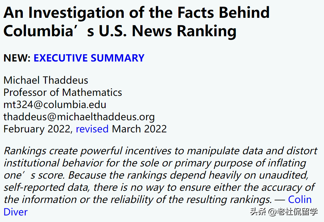 9月12日,“US News & World Report”发布22-23年美国综合大学排名。排名中焦点的是“哥伦比亚大学”从第二位狂跌至第18。(因数据作假,参考老杜之前的文章,从“哥大”涉嫌数据造假,看留学中的“光环效应”)Michael Thaddeu 撰写万字文章揭露“哥大”为排名数据作假掀起热议。
