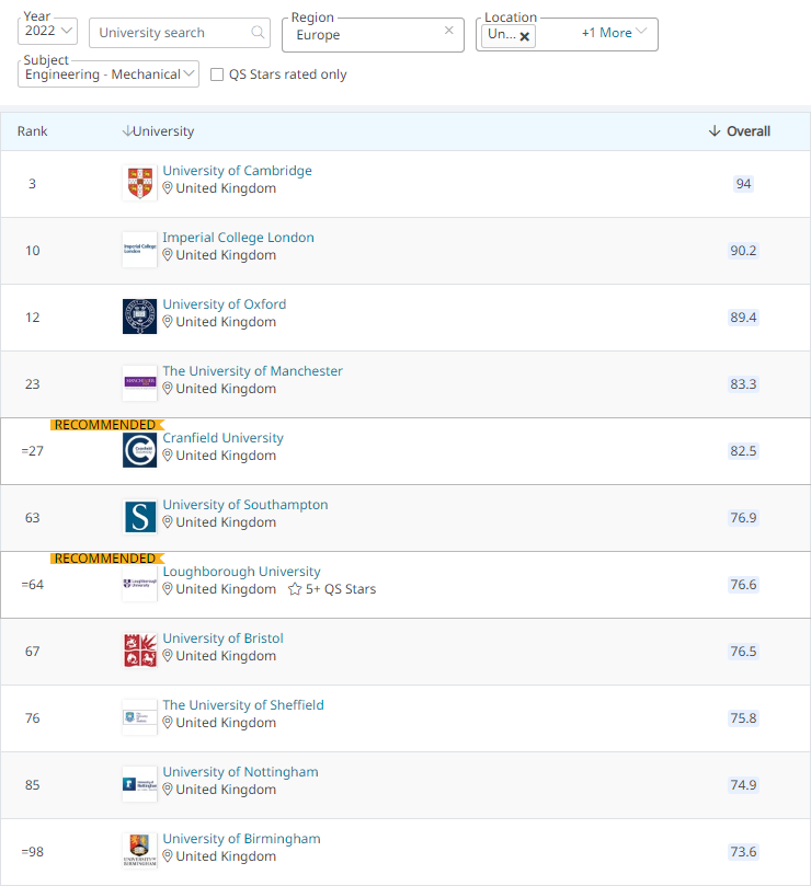 在最新的2022年QS机械、航空和制造工程专业排名中,英国院校榜单如下:
