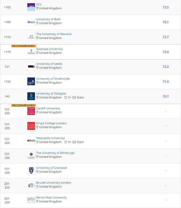 TOP100-200中开设此专业的热⻔学校有:伦敦大学学院、华威大学、利兹大学等。