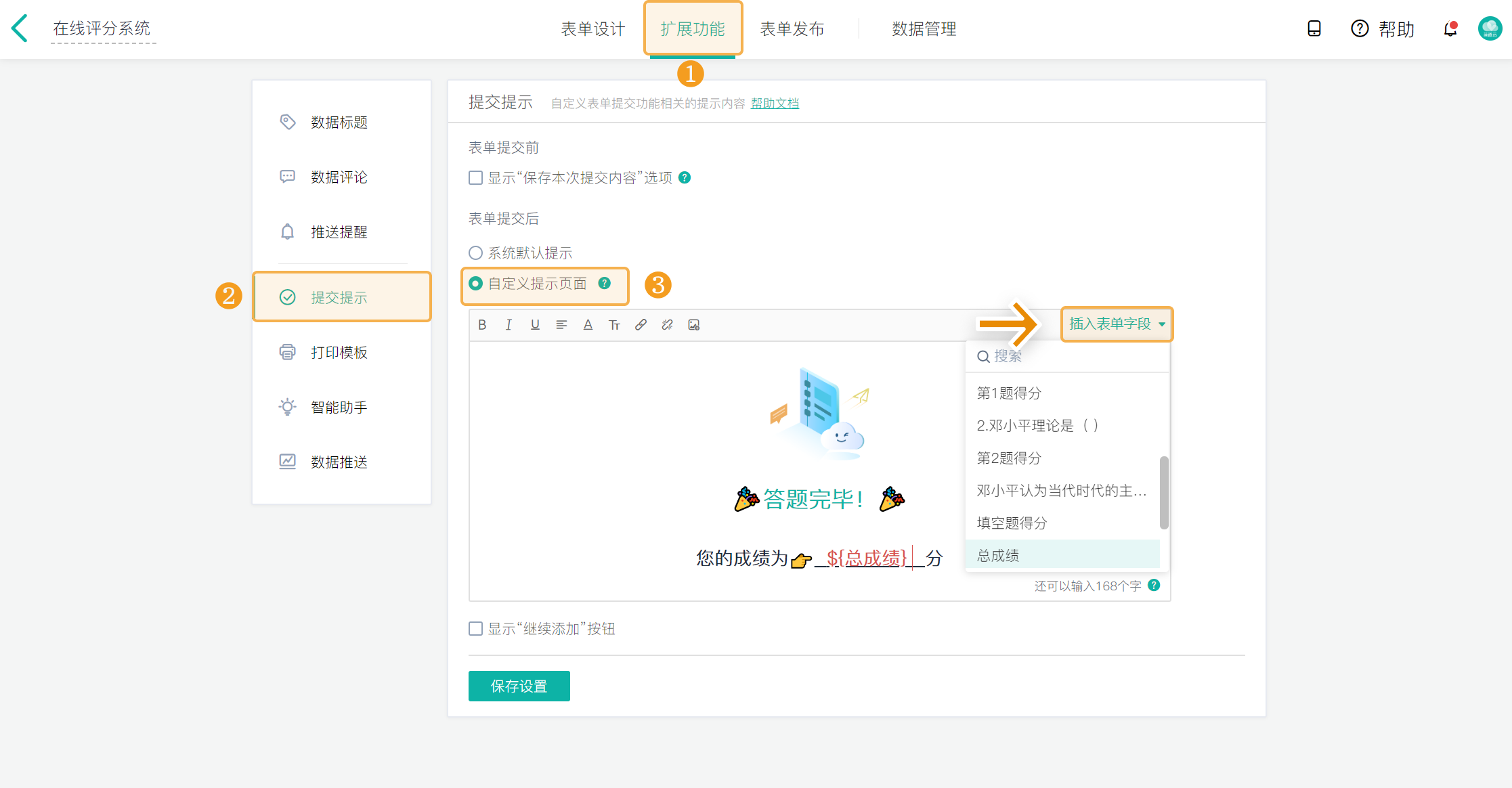 当设置好了题目及得分计算规则后,还可以设置自定义提交页面,在自定义提交页面将本次总成绩直接显示出来。