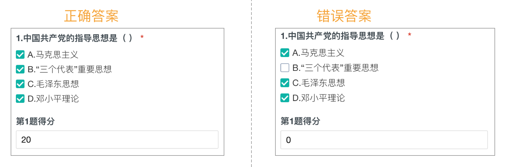 题目选择「复选框组」或者「下拉复选框」字段,得分为「数字字段」;