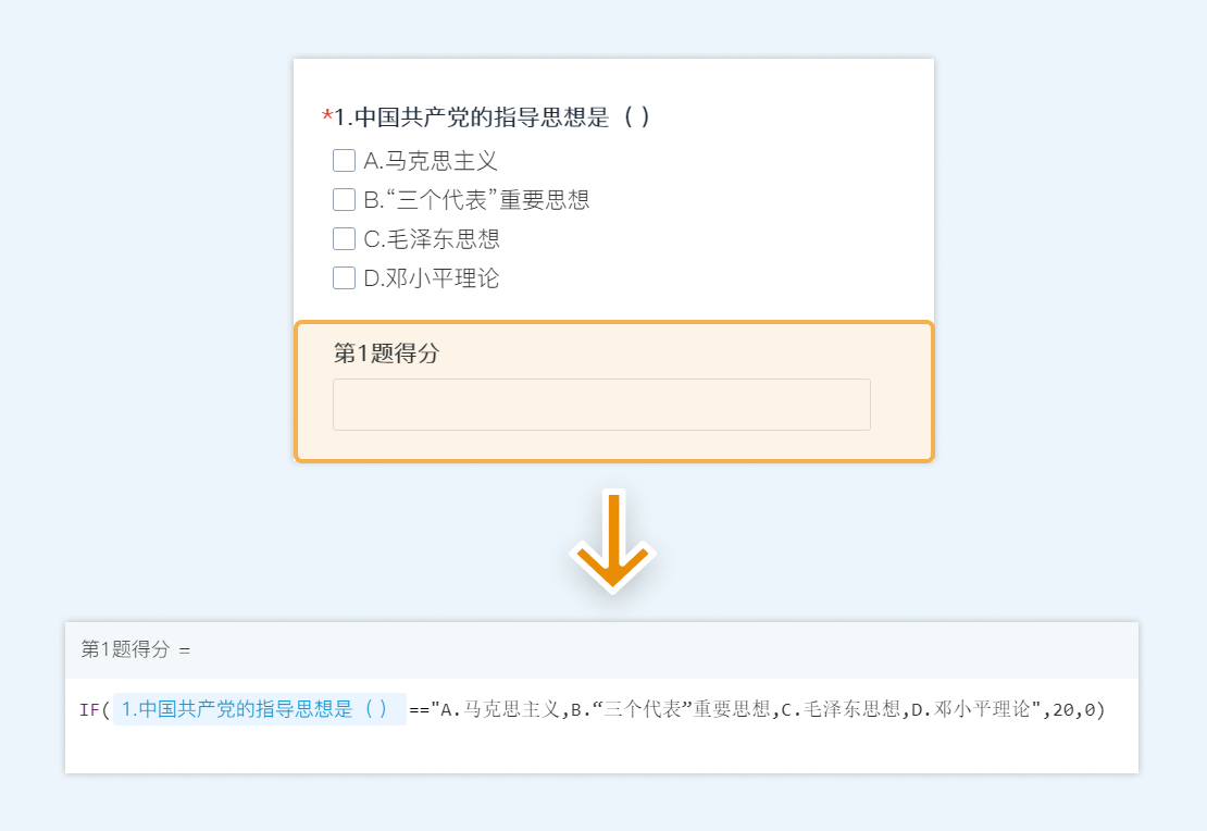 题目选择「单选按钮组」或「下拉框」字段,得分为「数字字段」;