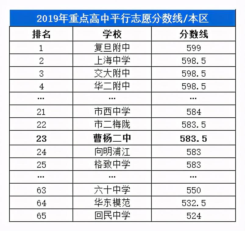 2019年曹杨二中中考录取分数线为583.5分,对比全市重点中学平行志愿分数线如此下,占据位置20出头,紧随四校八大之后。
